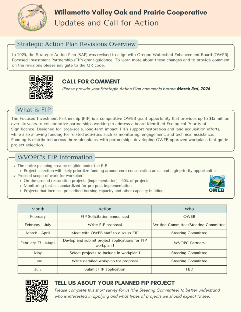 Time to come together to discuss the 2026 plan for the WVOPC at a Partners Meeting. We invite your participation in shaping our actions moving forward, including your ideas and contributions toward a June application for an OWEB Focused Investment Partnership (FIP) grant.